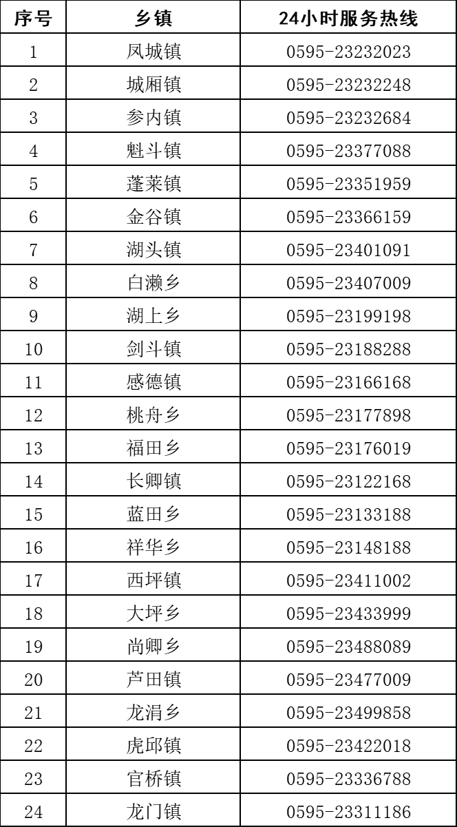 电话热线:0595-23265962或各乡镇24小时热线